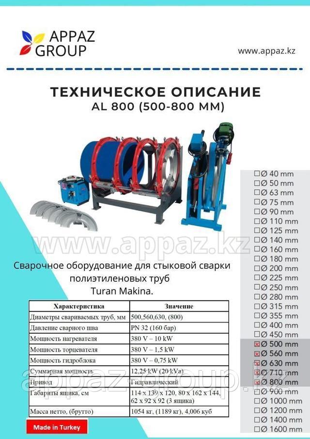 Turan Makina AL 800: предназначен для сварки труб диаметром от 500 до 800 мм. Имеет мощный гидравлический привод и возможность подключения блока протоколирования процесса сварки.
